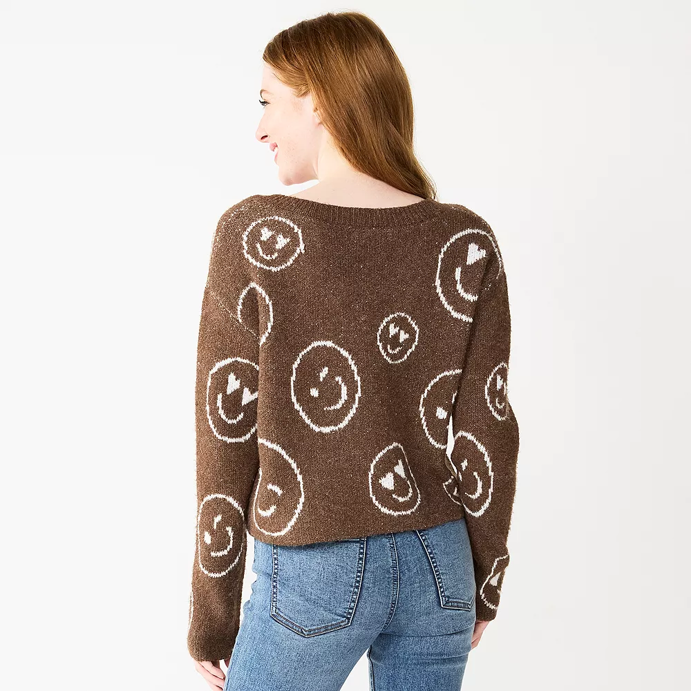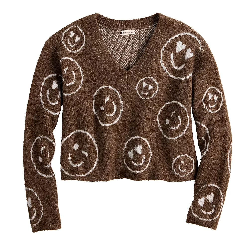 Stay comfy and cozy (but still stylish) this season with this juniors’ printed v-neck sweater from SO!