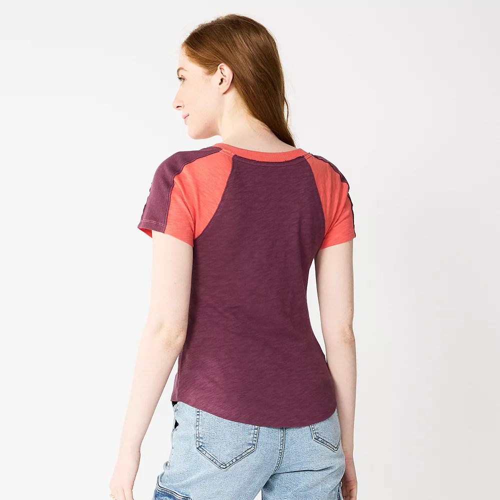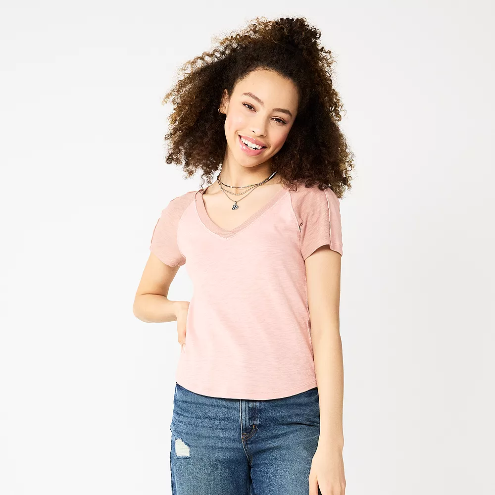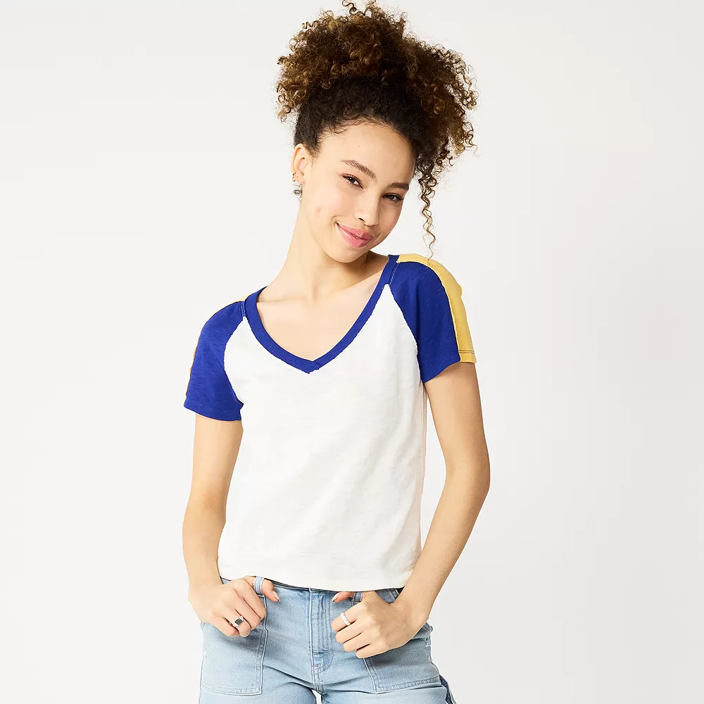 You simply can’t beat the classic look and comfy feel of this juniors’ raglan sleeve varsity tee from SO.