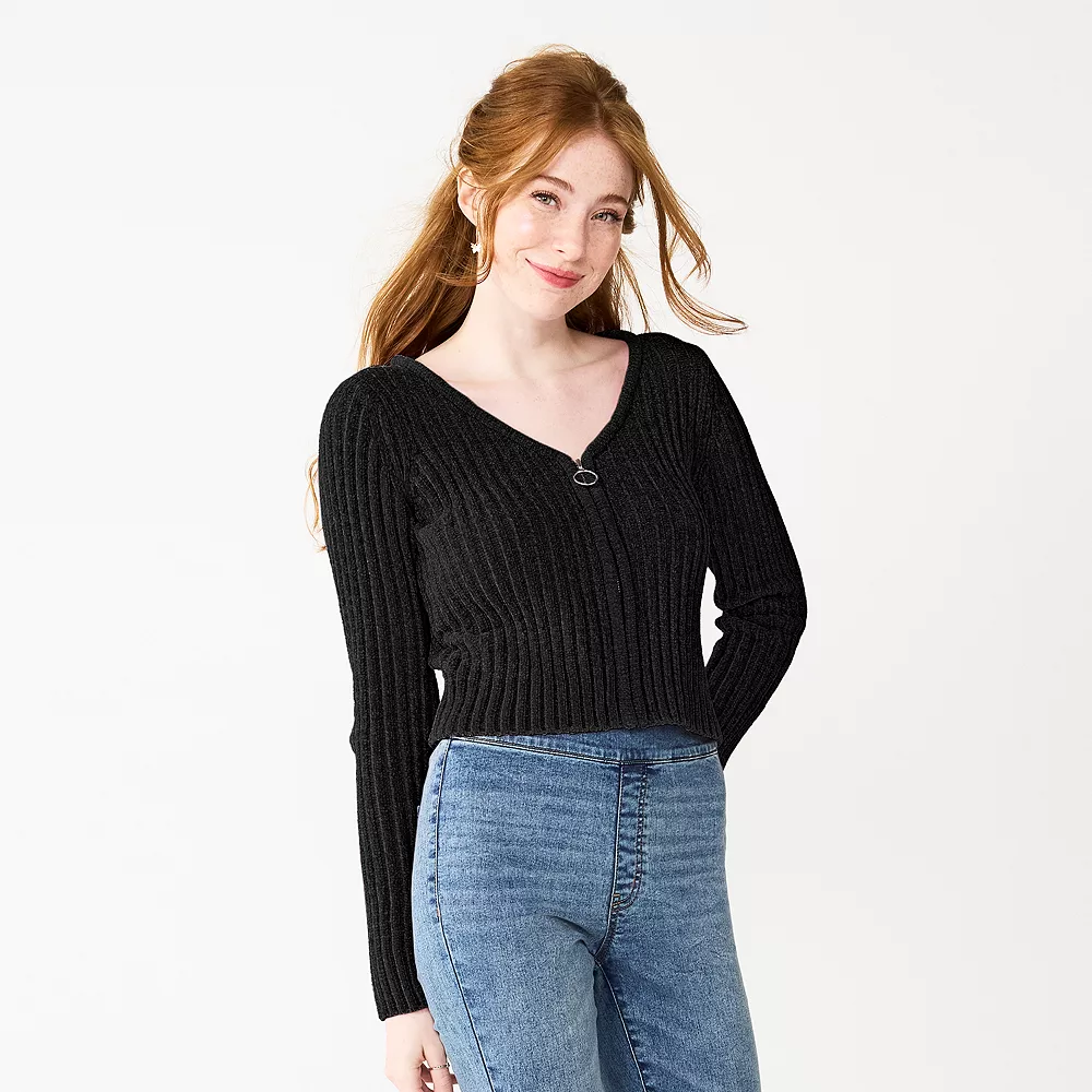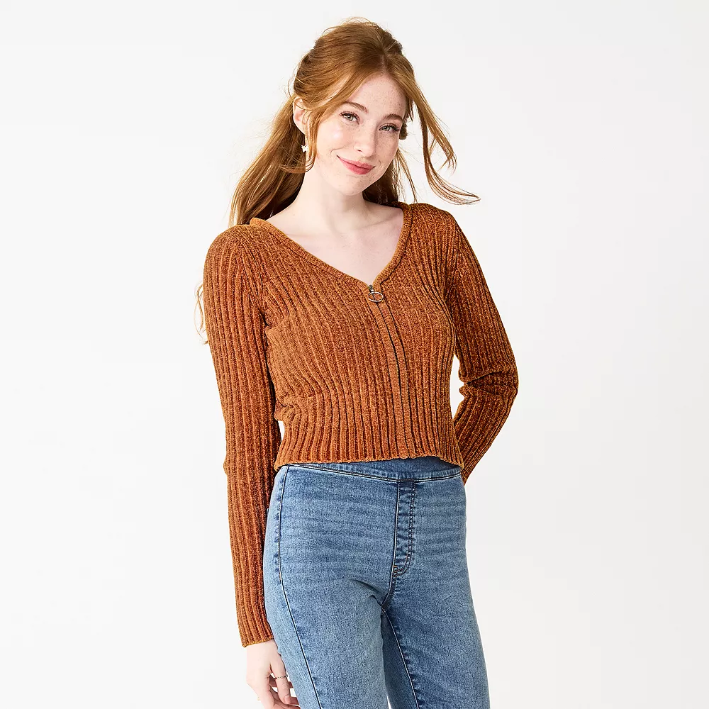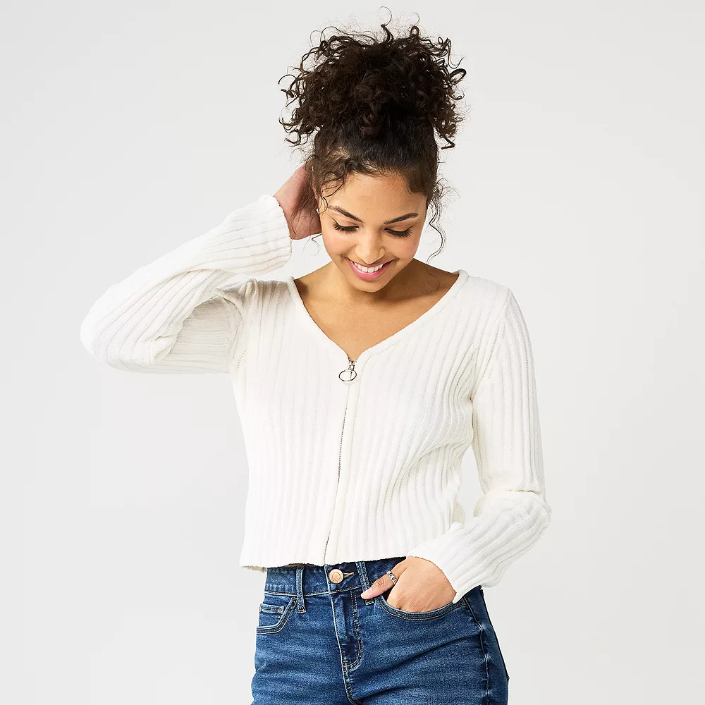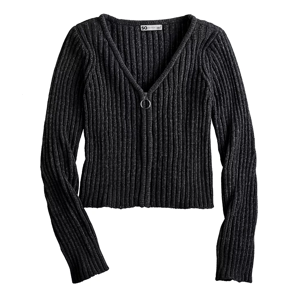 Stay comfy and cozy during colder weather with this front-zip juniors’ cropped cardigan from SO.